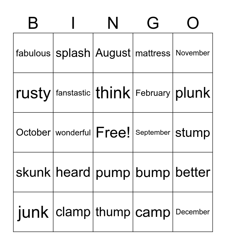 This bingo card has a free space and 29 words: junk, smelly, wonderful, lumpy, fabulous, August, fanstastic, heard, September, clamp, stump, December, thump, camp, plunk, January, pump, skunk, November, October, bump, marvelous, February, rusty, mattress, splash, better, think and trunk.