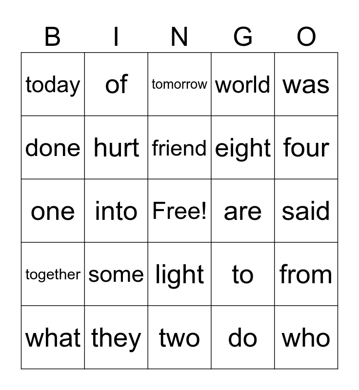 This bingo card has a free space and 35 words: start, drink, very, hurt, light, world, done, with, friend, color, one, was, you, come, today, are, do, into, together, who, to, what, from, they, tomorrow, four, love, where, eight, said, have, two, some, of and something.