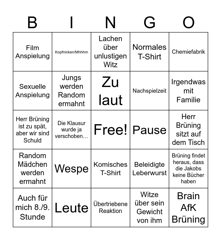 This bingo card has a free space and 24 words: Wespe, Leute, Zu laut, Auch für mich 8./9. Stunde, Chemiefabrik, Film Anspielung, Sexuelle Anspielung, Kopfnicken/Mhhhm, Pause, Komisches T-Shirt, Nachspielzeit, Herr Brüning ist zu spät, aber wir sind Schuld, Beleidigte Leberwurst, Brüning findet heraus, dass die Jakobs keine Bücher haben, Jungs werden Random ermahnt, Witze über sein Gewicht von ihm, Herr Brüning sitzt auf dem Tisch, Lachen über unlustigen Witz, Irgendwas mit Familie, Die Klausur wurde ja verschoben…, Brain AfK Brüning, Random Mädchen werden ermahnt, Normales T-Shirt and Übertriebene Reaktion.