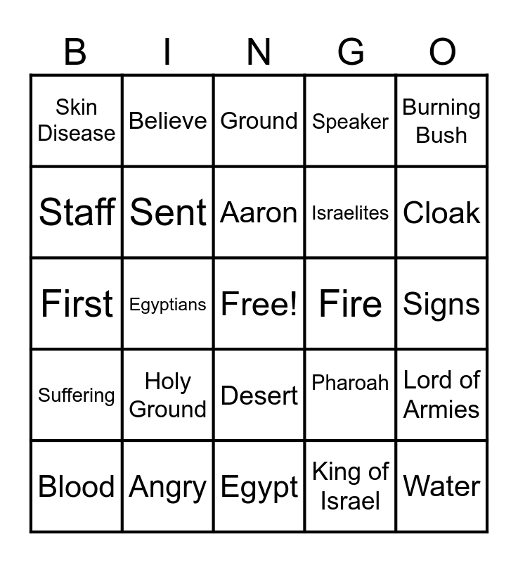 This bingo card has a free space and 39 words: Moses, Hand, Snake, Sent, Blood, Desert, Aaron, Sandals, Burning Bush, Suffering, Egyptians, Speaker, Water, Signs, Fire, Holy Ground, I AM, Skin Disease, Rescue, Pharoah, Staff, Egypt, Israelites, Cloak, Exodus, Sheep, Hid Face, Cry Out, Who Sent, Believe, Healed, Nile, Ground, Angry, King of Israel, Redeemer, Lord of Armies, First and Last.