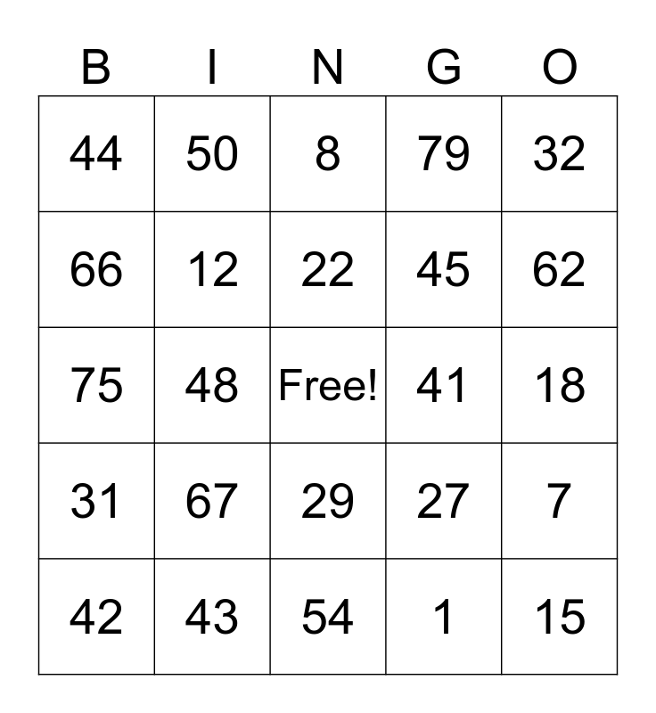 This bingo card has a free space and 24 words: 67, 43, 22, 42, 32, 44, 66, 50, 41, 29, 45, 75, 27, 7, 12, 1, 18, 8, 62, 48, 15, 31, 79 and 54.