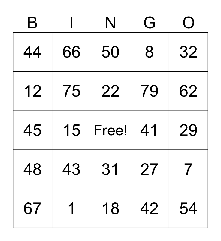 This bingo card has a free space and 24 words: 67, 43, 22, 42, 32, 44, 66, 50, 41, 29, 45, 75, 27, 7, 12, 1, 18, 8, 62, 48, 15, 31, 79 and 54.