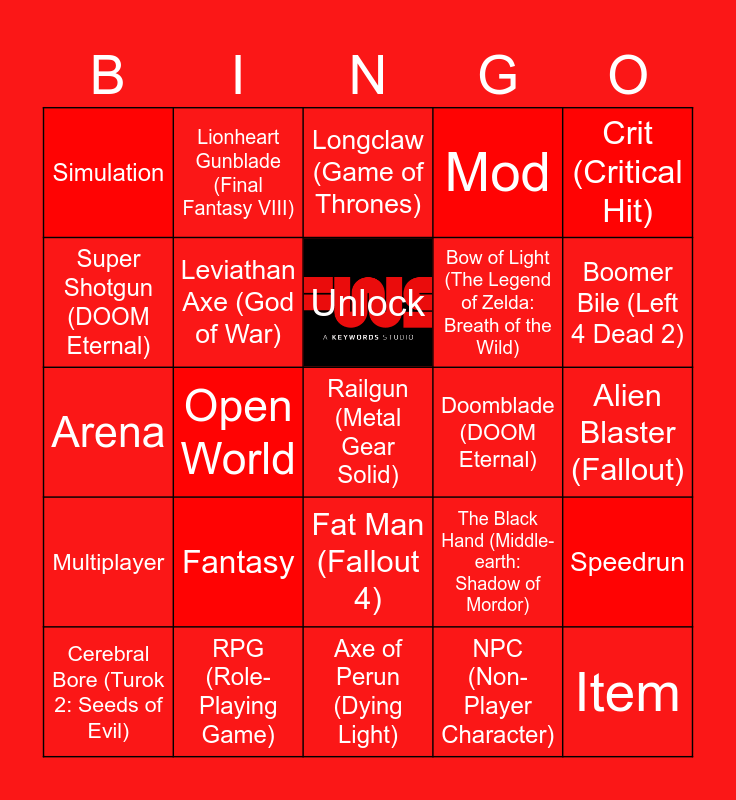 This bingo card has 1 images and 125 words: Boss, Level, Quest, XP (Experience Points), Loot, Dungeon, Multiplayer, Character, NPC (Non-Player Character), Power-up, Skill, Mission, Free!, Platformer, Sandbox, Survival, RPG (Role-Playing Game), Co-op, Strategy, Map, Item, Arena, Final Boss, Health, Crafting, Unlock, Mod, DLC (Downloadable Content), Achievement, Glitch, Speedrun, Emulator, Open World, Fantasy, Shooter, Sandbox, Puzzle, Indie, Battle Royale, Turn-Based, Simulation, Retro, Cutscene, Endgame, Lore, Clans, Tokens, Crit (Critical Hit), Respawn, Buff, Super Mega Death Rocket (League of Legends), Buster Sword (Final Fantasy VII), Master Sword (The Legend of Zelda), Mjölnir (God of War), Gravity Gun (Half-Life 2), Portal Gun (Portal), Blades of Chaos (God of War), Energy Sword (Halo), Red Queen (Devil May Cry), Doomblade (DOOM Eternal), Super Shotgun (DOOM Eternal), Keyblade (Kingdom Hearts), Murasama (Metal Gear Rising: Revengeance), Excalibur (The Witcher 3), Sword of Gryffindor (Harry Potter: Hogwarts Mystery), Thunderfury, Blessed Blade of the Windseeker (World of Warcraft), Frostmourne (World of Warcraft), Fat Man (Fallout 4), Gauss Rifle (Fallout 4), Alien Blaster (Fallout), M6D Magnum (Halo: Combat Evolved), Needler (Halo), Pulse Rifle (Destiny 2), Gjallarhorn (Destiny), Sleeper Simulant (Destiny 2), Lionheart (Final Fantasy VIII), Hidden Blade (Assassin's Creed), Ezio’s Armor (Assassin's Creed), Claymore Mine (Call of Duty), Ray Gun (Call of Duty: Zombies), Flamethrower (Resident Evil 2), Lancer (Gears of War), Boomshot (Gears of War), Cerebral Bore (Turok 2: Seeds of Evil), Leviathan Axe (God of War), Tamahagane Katana (Ghost of Tsushima), Medusa’s Bow (Assassin's Creed Odyssey), Dante’s Ebony & Ivory (Devil May Cry), Maw of the Dragonlord (World of Warcraft), Twin Blades of Azzinoth (World of Warcraft), Bloodskal Blade (The Elder Scrolls V: Skyrim), Dragonbone Bow (Skyrim), Wabbajack (The Elder Scrolls), Umbra (The Elder Scrolls: Oblivion), Longclaw (Game of Thrones), Axe of Perun (Dying Light), Golden Gun (Destiny 2), Zanpakuto (Bleach: Soul Resurrección), Sparrow (Destiny 2), Railgun (Metal Gear Solid), Whisper of the Worm (Destiny 2), The Black Hand (Middle-earth: Shadow of Mordor), Hellfire Shotgun (Overwatch), Lucille (The Walking Dead), Silver Saber (The Witcher 3), Aerondight (The Witcher 3), Harpoon Gun (Subnautica), Boomer Bile (Left 4 Dead 2), Needle Rifle (Halo: Reach), Biggoron’s Sword (The Legend of Zelda: Ocarina of Time), Hylian Shield (The Legend of Zelda), Bomb Bag (The Legend of Zelda: Twilight Princess), Voidwalker (Destiny 2), Kukri (Far Cry 4), Shovel Launcher (Far Cry 5), Blunderbuss (Bloodborne), Hunter’s Axe (Bloodborne), Stormbreaker (Marvel’s Avengers), Widowmaker (Overwatch), Bow of Light (The Legend of Zelda: Breath of the Wild), Ancient Arrow (The Legend of Zelda: Breath of the Wild), Gnasher (Gears of War), Plasma Cutter (Dead Space), Lionheart Gunblade (Final Fantasy VIII) and N7 Valkyrie (Mass Effect 3).