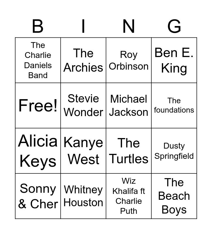 This bingo card has 16 words: Whitney Houston, Dusty Springfield, Roy Orbinson, The Charlie Daniels Band, Alicia Keys, The Archies, The Turtles, Wiz Khalifa ft Charlie Puth, Free!, Stevie Wonder, Sonny & Cher, Ben E. King, Kanye West, The foundations, Michael Jackson and The Beach Boys.