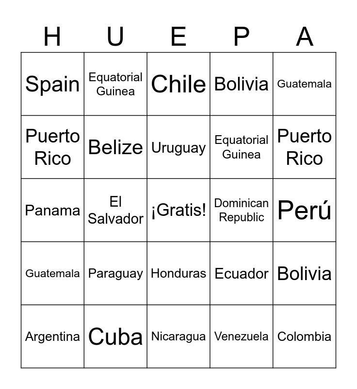 ⚠ This card has duplicate items: Mexico (2), Colombia (2), Spain (2), Argentina (2), Perú (2), Venezuela (2), Chile (2), Ecuador (2), Guatemala (2), Cuba (2), Bolivia (2), Dominican Republic (2), Honduras (2), Paraguay (2), El Salvador (2), Nicaragua (2), Costa Rica (2), Panama (2), Uruguay (2), Puerto Rico (2), Equatorial Guinea (2)