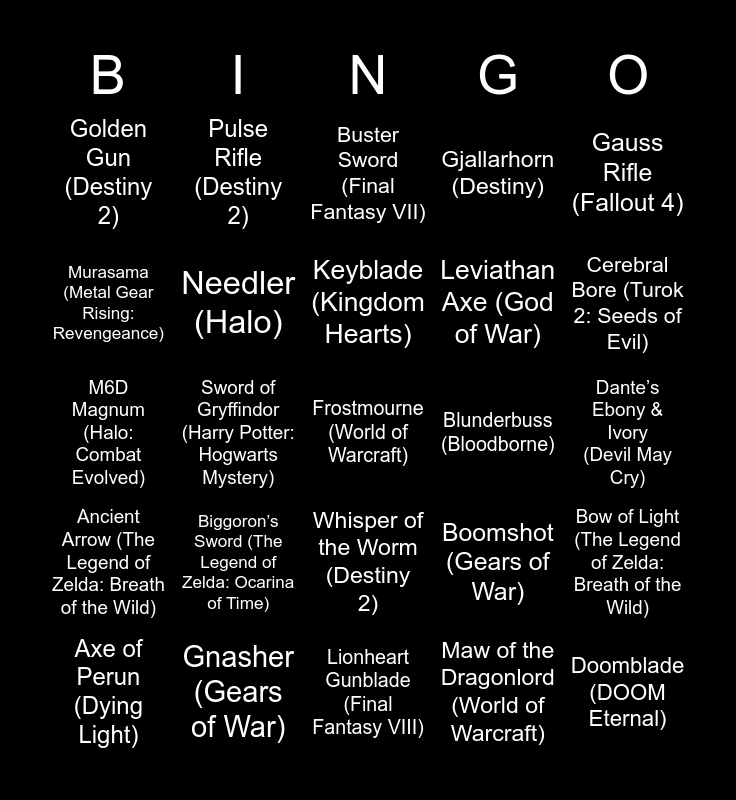 This bingo card has 76 words: Free!, Super Mega Death Rocket (League of Legends), Buster Sword (Final Fantasy VII), Master Sword (The Legend of Zelda), Mjölnir (God of War), Gravity Gun (Half-Life 2), Portal Gun (Portal), Blades of Chaos (God of War), Energy Sword (Halo), Red Queen (Devil May Cry), Doomblade (DOOM Eternal), Super Shotgun (DOOM Eternal), Keyblade (Kingdom Hearts), Murasama (Metal Gear Rising: Revengeance), Excalibur (The Witcher 3), Sword of Gryffindor (Harry Potter: Hogwarts Mystery), Thunderfury, Blessed Blade of the Windseeker (World of Warcraft), Frostmourne (World of Warcraft), Fat Man (Fallout 4), Gauss Rifle (Fallout 4), Alien Blaster (Fallout), M6D Magnum (Halo: Combat Evolved), Needler (Halo), Pulse Rifle (Destiny 2), Gjallarhorn (Destiny), Sleeper Simulant (Destiny 2), Lionheart (Final Fantasy VIII), Hidden Blade (Assassin's Creed), Ezio’s Armor (Assassin's Creed), Claymore Mine (Call of Duty), Ray Gun (Call of Duty: Zombies), Flamethrower (Resident Evil 2), Lancer (Gears of War), Boomshot (Gears of War), Cerebral Bore (Turok 2: Seeds of Evil), Leviathan Axe (God of War), Tamahagane Katana (Ghost of Tsushima), Medusa’s Bow (Assassin's Creed Odyssey), Dante’s Ebony & Ivory (Devil May Cry), Maw of the Dragonlord (World of Warcraft), Twin Blades of Azzinoth (World of Warcraft), Bloodskal Blade (The Elder Scrolls V: Skyrim), Dragonbone Bow (Skyrim), Wabbajack (The Elder Scrolls), Umbra (The Elder Scrolls: Oblivion), Longclaw (Game of Thrones), Axe of Perun (Dying Light), Golden Gun (Destiny 2), Zanpakuto (Bleach: Soul Resurrección), Sparrow (Destiny 2), Railgun (Metal Gear Solid), Whisper of the Worm (Destiny 2), The Black Hand (Middle-earth: Shadow of Mordor), Hellfire Shotgun (Overwatch), Lucille (The Walking Dead), Silver Saber (The Witcher 3), Aerondight (The Witcher 3), Harpoon Gun (Subnautica), Boomer Bile (Left 4 Dead 2), Needle Rifle (Halo: Reach), Biggoron’s Sword (The Legend of Zelda: Ocarina of Time), Hylian Shield (The Legend of Zelda), Bomb Bag (The Legend of Zelda: Twilight Princess), Voidwalker (Destiny 2), Kukri (Far Cry 4), Shovel Launcher (Far Cry 5), Blunderbuss (Bloodborne), Hunter’s Axe (Bloodborne), Stormbreaker (Marvel’s Avengers), Widowmaker (Overwatch), Bow of Light (The Legend of Zelda: Breath of the Wild), Ancient Arrow (The Legend of Zelda: Breath of the Wild), Gnasher (Gears of War), Plasma Cutter (Dead Space), Lionheart Gunblade (Final Fantasy VIII) and N7 Valkyrie (Mass Effect 3).