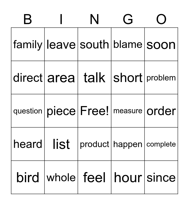 This bingo card has a free space and 25 words: list, feel, talk, bird, soon, family, direct, leave, measure, product, short, question, happen, complete, area, rock, order, south, problem, piece, since, whole, heard, blame and hour.