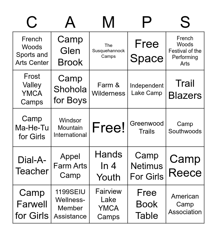 This bingo card has a free space and 25 words: Appel Farm Arts Camp, Fairview Lake YMCA Camps, Farm & Wilderness, Camp Farwell for Girls, French Woods Festival of the Performing Arts, French Woods Sports and Arts Center, Frost Valley YMCA Camps, Camp Glen Brook, Greenwood Trails, Hands In 4 Youth, Independent Lake Camp, Camp Ma-He-Tu for Girls, Camp Netimus For Girls, Camp Reece, Camp Shohola for Boys, Southampton Fresh Air Home, Camp Southwoods, The Susquehannock Camps, Trail Blazers, Windsor Mountain International, American Camp Association, 1199SEIU Wellness-Member Assistance, Dial-A-Teacher, Free Space and Free Book Table.