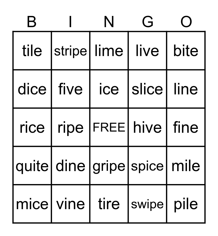 This bingo card has a free space and 37 words: kite, dime, pipe, five, mile, dine, ice, fire, bite, time, ripe, live, pile, fine, dice, quite, spite, lime, gripe, hive, tile, line, mice, tire, white, swipe, stripe, dive, drive, smile, shine, vine, rice, price, spice, slice and wire.
