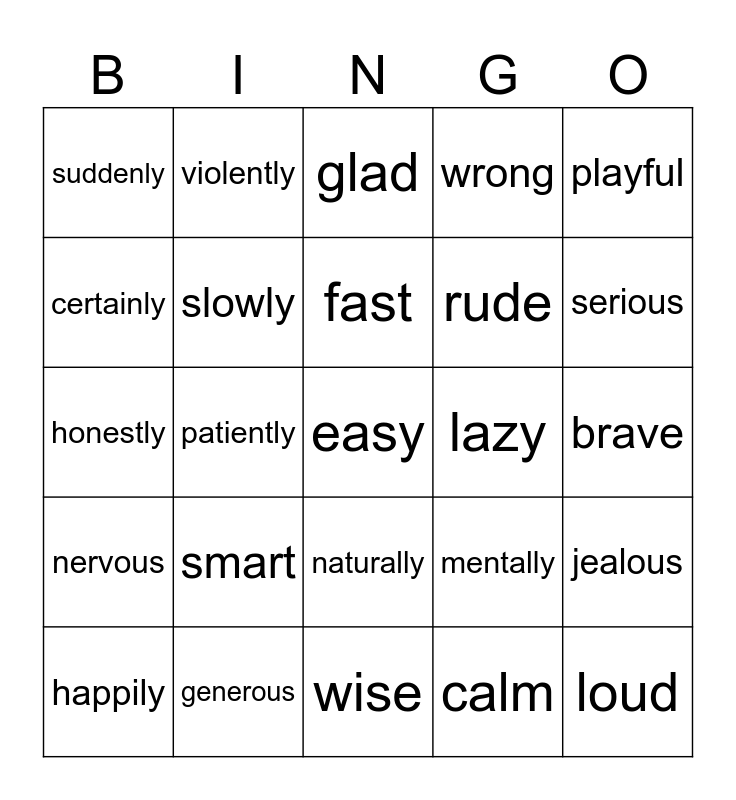 This bingo card has a free space and 24 words: smart, generous, fast, happily, playful, suddenly, certainly, violently, lazy, naturally, rude, honestly, mentally, jealous, slowly, calm, brave, glad, serious, patiently, loud, nervous, wrong and wise.