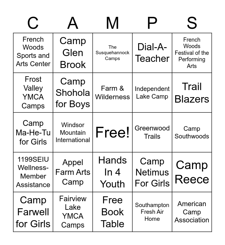 This bingo card has a free space and 24 words: Appel Farm Arts Camp, Fairview Lake YMCA Camps, Farm & Wilderness, Camp Farwell for Girls, French Woods Festival of the Performing Arts, French Woods Sports and Arts Center, Frost Valley YMCA Camps, Camp Glen Brook, Greenwood Trails, Hands In 4 Youth, Independent Lake Camp, Camp Ma-He-Tu for Girls, Camp Netimus For Girls, Camp Reece, Camp Shohola for Boys, Southampton Fresh Air Home, Camp Southwoods, The Susquehannock Camps, Trail Blazers, Windsor Mountain International, American Camp Association, 1199SEIU Wellness-Member Assistance, Dial-A-Teacher and Free Book Table.