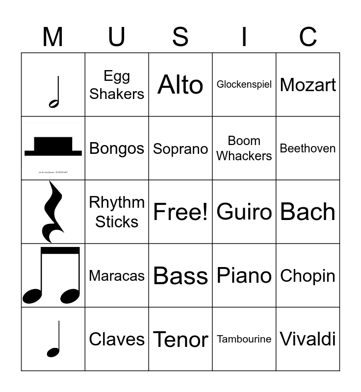 This bingo card has 5 images, a free space and 19 words: Maracas, Soprano, Tambourine, Mozart, Egg Shakers, Alto, Guiro, Bach, Bongos, Piano, Chopin, Claves, Tenor, Glockenspiel, Beethoven, Rhythm Sticks, Bass, Boom Whackers and Vivaldi.