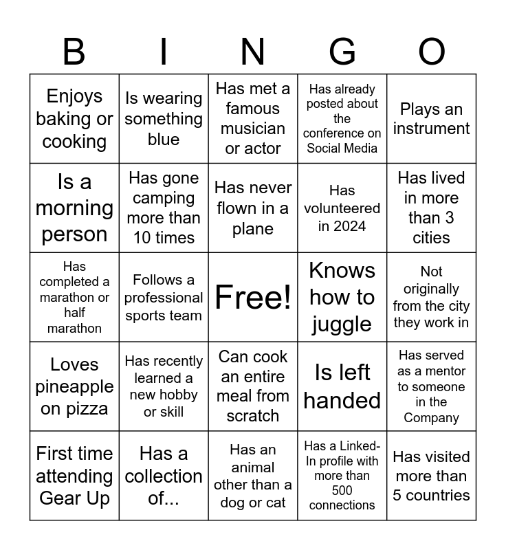 This bingo card has a free space and 24 words: Has recently learned a new hobby or skill, Has a collection of..., Has never flown in a plane, First time attending Gear Up, Plays an instrument, Enjoys baking or cooking, Is a morning person, Is wearing something blue, Knows how to juggle, Can cook an entire meal from scratch, Has volunteered in 2024, Has completed a marathon or half marathon, Is left handed, Has served as a mentor to someone in the Company, Has gone camping more than 10 times, Has a Linked-In profile with more than 500 connections, Not originally from the city they work in, Has met a famous musician or actor, Has lived in more than 3 cities, Follows a professional sports team, Has visited more than 5 countries, Loves pineapple on pizza, Has already posted about the conference on Social Media and Has an animal other than a dog or cat.