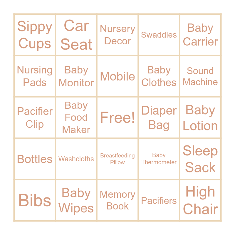 This bingo card has a free space and 60 words: Diapers, Baby Wipes, Onesies, Bottles, Pacifiers, Blankets, Baby Monitor, Books, Baby Clothes, Teething Toys, Swaddles, Bath Products, Nursing Pads, Stroller, Changing Pad, Sippy Cups, High Chair, Baby Carrier, Gift Cards, Mobile, Diaper Bag, Nursery Decor, Bibs, Sleep Sack, Baby Shoes, Breast Pump, Formula, Play Mat, Sound Machine, Baby Gym, Baby Books, Rattles, Baby First Aid Kit, Baby Nail Clipper, Car Seat, Burp Cloths, Wall Art, Baby Food Maker, Teething Mittens, Pacifier Clip, Personalized Blanket, Washcloths, Baby Lotion, Hooded Towel, Baby Thermometer, Pacifier Holder, Safety Kit, Playpen, Travel Crib, Breastfeeding Pillow, Memory Book, Suction Plates, Changing Table, Gift Sets (e.g., bath or grooming), Muslin Wraps, Baby Food Storage Containers, Bouncer, Baby Journal, Stuffed Animal and Knit Hat.
