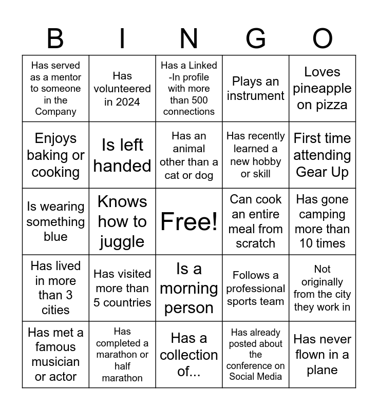 This bingo card has a free space and 24 words: Has visited more than 5 countries, Has completed a marathon or half marathon, Has an animal other than a cat or dog, Has met a famous musician or actor, Loves pineapple on pizza, Has served as a mentor to someone in the Company, Enjoys baking or cooking, Has volunteered in 2024, Can cook an entire meal from scratch, Is a morning person, Has recently learned a new hobby or skill, Is wearing something blue, Follows a professional sports team, Not originally from the city they work in, Is left handed, Has already posted about the conference on Social Media, Has gone camping more than 10 times, Has a Linked -In profile with more than 500 connections, First time attending Gear Up, Knows how to juggle, Has never flown in a plane, Has lived in more than 3 cities, Plays an instrument and Has a collection of....