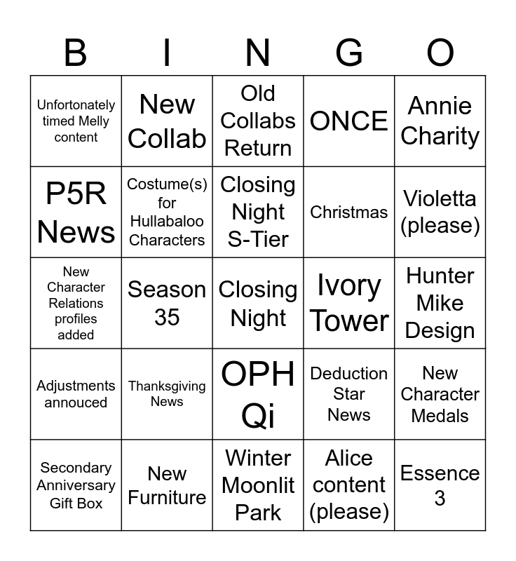 This bingo card has a free space and 24 words: Thanksgiving News, New Furniture, Closing Night S-Tier, Secondary Anniversary Gift Box, Annie Charity, Unfortonately timed Melly content, P5R News, New Collab, Ivory Tower, OPH Qi, Christmas, New Character Relations profiles added, Deduction Star News, New Character Medals, Costume(s) for Hullabaloo Characters, Alice content (please), Hunter Mike Design, Old Collabs Return, Violetta (please), Season 35, Essence 3, Adjustments annouced, ONCE and Winter Moonlit Park.