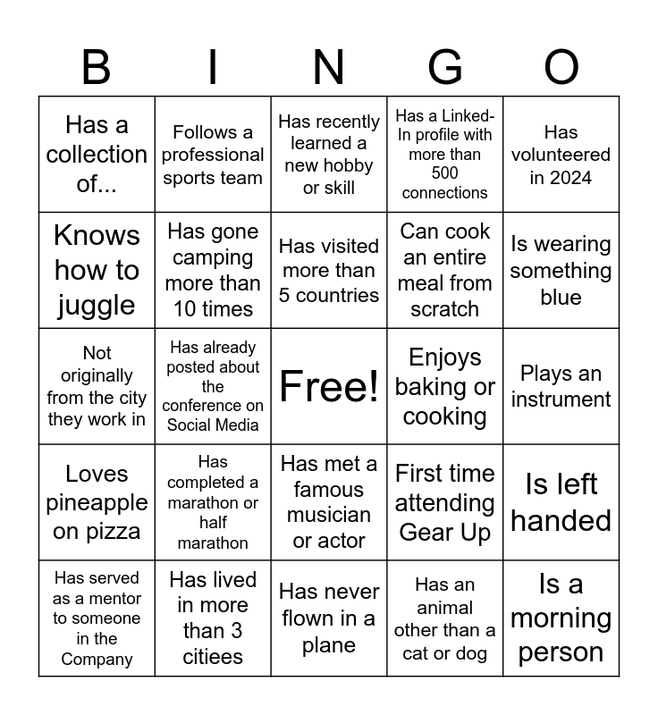 This bingo card has a free space and 24 words: Has completed a marathon or half marathon, Has lived in more than 3 citiees, Has visited more than 5 countries, Has served as a mentor to someone in the Company, Has volunteered in 2024, Has a collection of..., Knows how to juggle, Follows a professional sports team, Enjoys baking or cooking, Has met a famous musician or actor, Can cook an entire meal from scratch, Not originally from the city they work in, First time attending Gear Up, Is left handed, Has gone camping more than 10 times, Has an animal other than a cat or dog, Plays an instrument, Has recently learned a new hobby or skill, Is wearing something blue, Has already posted about the conference on Social Media, Is a morning person, Loves pineapple on pizza, Has a Linked-In profile with more than 500 connections and Has never flown in a plane.