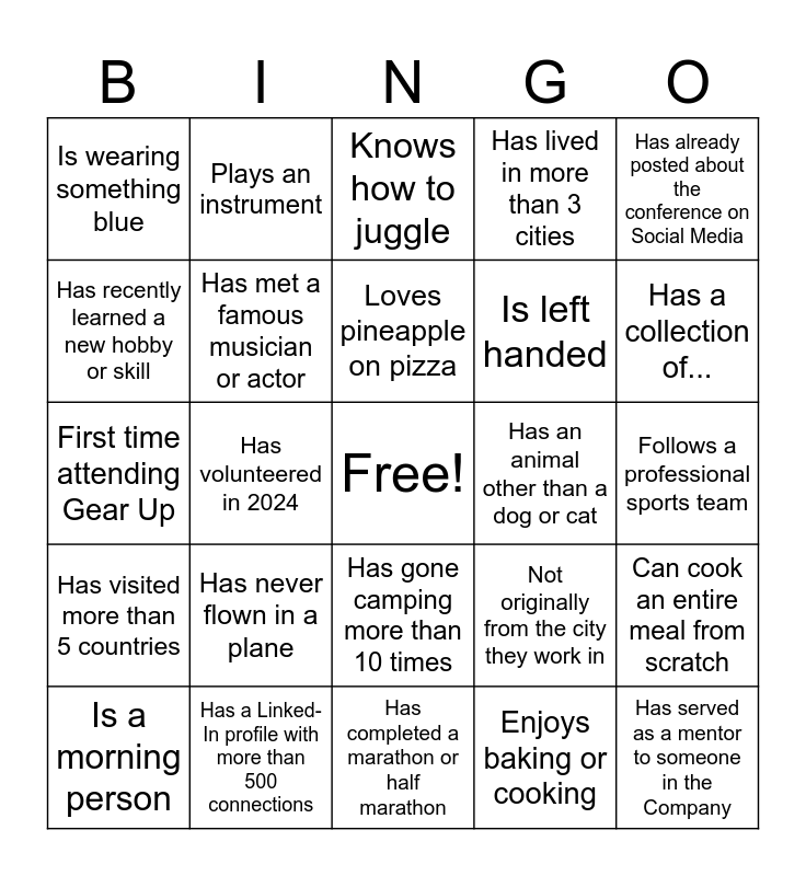This bingo card has a free space and 24 words: Has never flown in a plane, Has a Linked-In profile with more than 500 connections, Loves pineapple on pizza, Is a morning person, Has already posted about the conference on Social Media, Is wearing something blue, Has recently learned a new hobby or skill, Plays an instrument, Has an animal other than a dog or cat, Has gone camping more than 10 times, Is left handed, First time attending Gear Up, Not originally from the city they work in, Can cook an entire meal from scratch, Has met a famous musician or actor, Enjoys baking or cooking, Follows a professional sports team, Knows how to juggle, Has a collection of..., Has volunteered in 2024, Has served as a mentor to someone in the Company, Has visited more than 5 countries, Has lived in more than 3 cities and Has completed a marathon or half marathon.