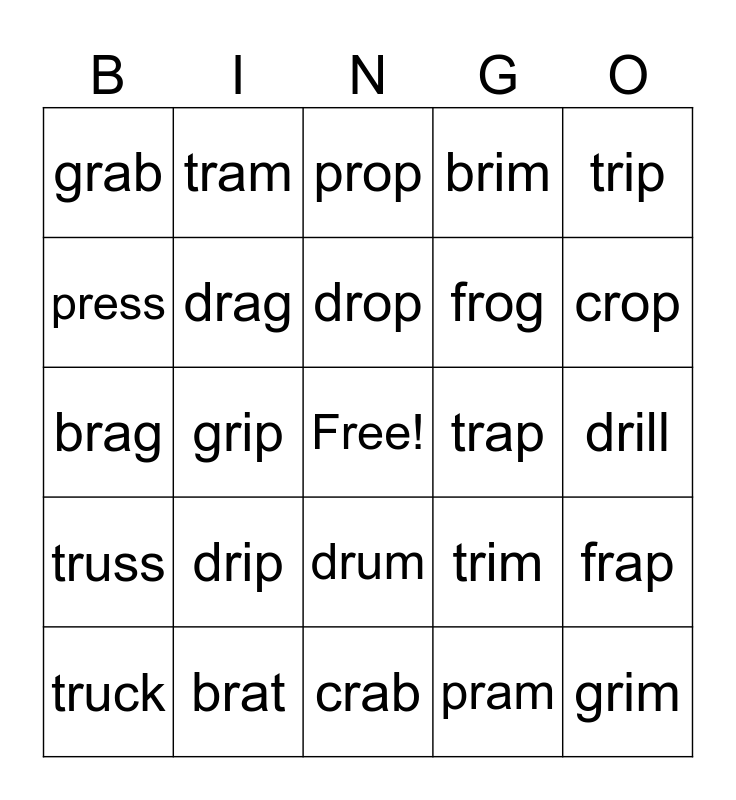This bingo card has a free space and 28 words: frap, fret, frog, pram, press, prop, tram, truss, trap, truck, brag, brim, brat, crab, crop, crib, drip, drag, drop, drum, grab, grub, grim, grip, drill, trim, trip and grass.