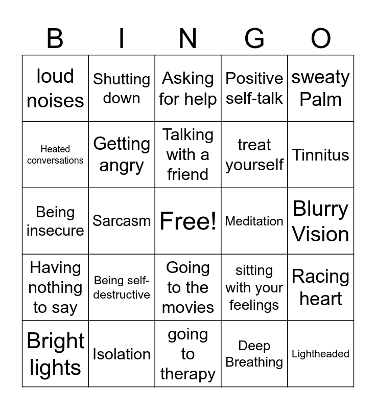This bingo card has a free space and 29 words: Crowded Places, Isolation, Asking for help, Relaxation techniques, sweaty Palm, loud noises, Getting angry, Talking with a friend, Meditation, Racing heart, Bright lights, Sarcasm, Deep Breathing, Lightheaded, Being insecure, Binging, going to therapy, sitting with your feelings, Tinnitus, Having nothing to say, Being self- destructive, sharing a meal, treat yourself, Blurry Vision, Heated conversations, Shutting down, Going to the movies, Positive self-talk and Outburst.
