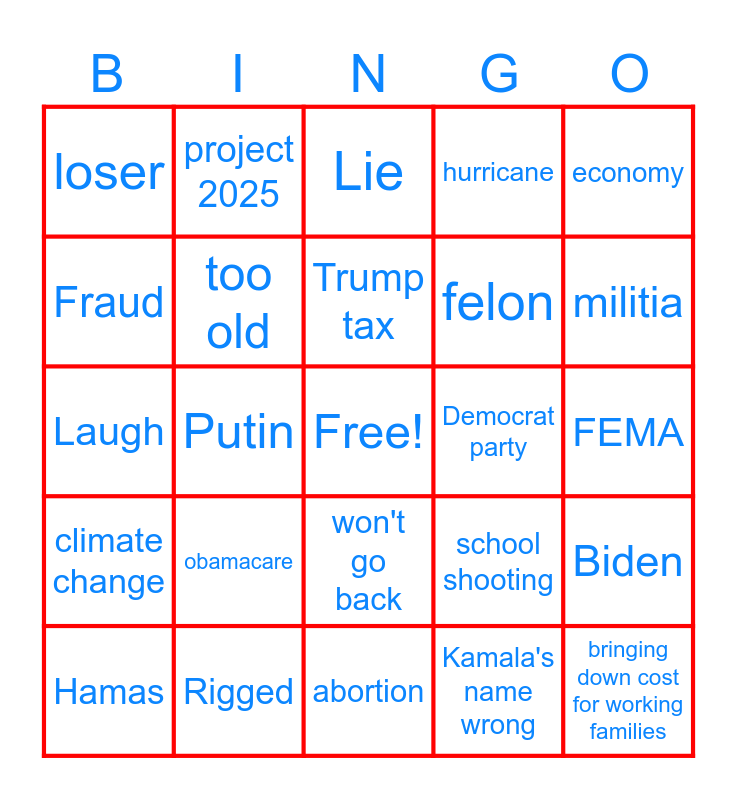 This bingo card has a free space and 24 words: obamacare, Rigged, Trump tax, Hamas, economy, loser, Fraud, project 2025, Democrat party, won't go back, felon, Laugh, school shooting, Biden, too old, Kamala's name wrong, FEMA, Lie, militia, Putin, bringing down cost for working families, climate change, hurricane and abortion.