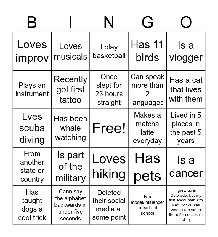 This bingo card has a free space and 31 words: Deleted their social media at some point, Has aphantasia (can't visualize anything ever), Has been whale watching, I like learning about historical natural disasters!, Loves improv, I play basketball, Recently got first tattoo, Has pets, Makes a matcha latte everyday, Is a model/influencer outside of school, Lived in 5 places in the past 5 years, I grew up in Colorado, but my first encounter with Red Rocks was when I ran stairs there for soccer. (It kills), Ran with the bulls in Pamplona, Played violin in high school, Has a cat that lives with them, Watched the filming of a movie, Is a dancer, Is part of the military, From another state or country, Loves hiking, Is a vlogger, Originally from a tropical place, Has taught dogs a cool trick, Loves musicals, Can speak more than 2 languages, Plays an instrument, Has 11 birds, Lves scuba diving, Cann say the alphabet backwards in under five seconds, Once slept for 23 hours straight and Has been bald.