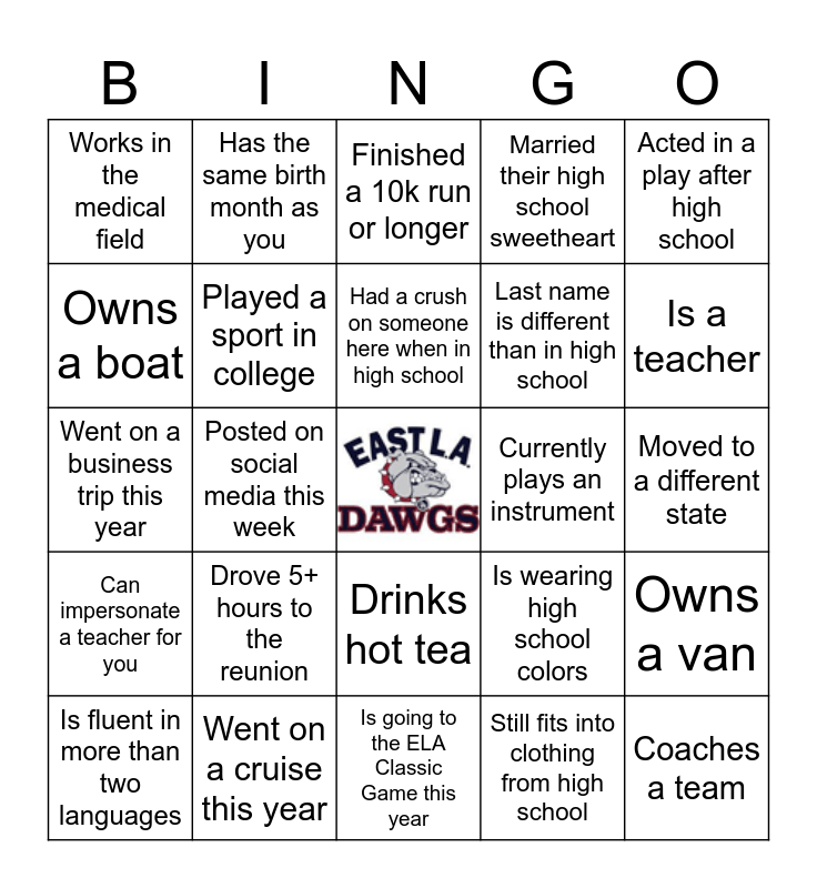 This bingo card has a free space and 24 words: Drove 5+ hours to the reunion, Went on a cruise this year, Had a crush on someone here when in high school, Is fluent in more than two languages, Acted in a play after high school, Works in the medical field, Owns a boat, Has the same birth month as you, Currently plays an instrument, Drinks hot tea, Last name is different than in high school, Went on a business trip this year, Is wearing high school colors, Owns a van, Played a sport in college, Still fits into clothing from high school, Moved to a different state, Finished a 10k run or longer, Is a teacher, Posted on social media this week, Coaches a team, Can impersonate a teacher for you, Married their high school sweetheart and Is going to the ELA Classic Game this year.