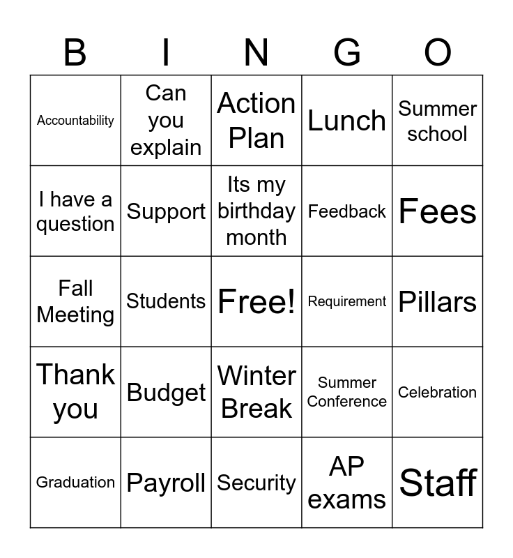 This bingo card has a free space and 24 words: Budget, Payroll, Its my birthday month, Graduation, Summer school, Accountability, I have a question, Can you explain, Requirement, Winter Break, Feedback, Fall Meeting, Summer Conference, Celebration, Support, AP exams, Pillars, Action Plan, Fees, Students, Staff, Thank you, Lunch and Security.