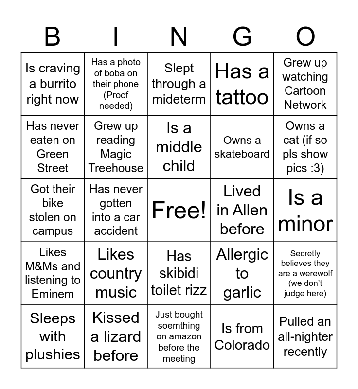 This bingo card has a free space and 24 words: Likes country music, Kissed a lizard before, Is a middle child, Sleeps with plushies, Grew up watching Cartoon Network, Is craving a burrito right now, Has never eaten on Green Street, Has a photo of boba on their phone (Proof needed), Lived in Allen before, Has skibidi toilet rizz, Owns a skateboard, Got their bike stolen on campus, Allergic to garlic, Secretly believes they are a werewolf (we don’t judge here), Grew up reading Magic Treehouse, Is from Colorado, Is a minor, Slept through a mideterm, Owns a cat (if so pls show pics :3), Has never gotten into a car accident, Pulled an all-nighter recently, Likes M&Ms and listening to Eminem, Has a tattoo and Just bought soemthing on amazon before the meeting.