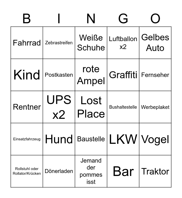This bingo card has a free space and 24 words: Hund, Dönerladen, rote Ampel, Rollstuhl oder Rollator/Krücken, Gelbes Auto, Fahrrad, Kind, Zebrastreifen, Bushaltestelle, Baustelle, Graffiti, Rentner, LKW, Vogel, Postkasten, Bar, Werbeplaket, Weiße Schuhe, Fernseher, UPS x2, Traktor, Einsatzfahrzeug, Luftballon x2 and Jemand der pommes isst.