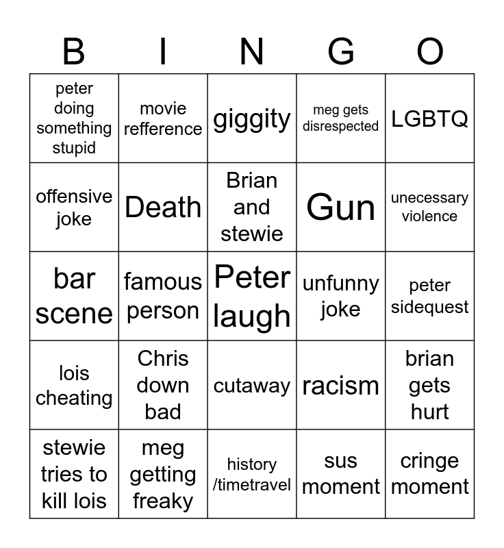 This bingo card has a free space and 24 words: Chris down bad, meg getting freaky, Brian and stewie, stewie tries to kill lois, LGBTQ, peter doing something stupid, offensive joke, movie refference, unfunny joke, cutaway, Gun, bar scene, racism, brian gets hurt, Death, sus moment, peter sidequest, giggity, unecessary violence, famous person, cringe moment, lois cheating, meg gets disrespected and history /timetravel.