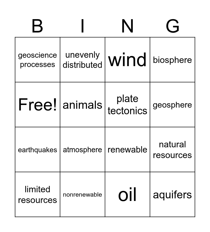 This bingo card has 16 words: nonrenewable, natural resources, wind, geoscience processes, earthquakes, unevenly distributed, renewable, oil, Free!, animals, limited resources, biosphere, atmosphere, geosphere, plate tectonics and aquifers.