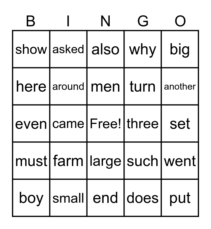 This bingo card has a free space and 29 words: boy, following, came, want, show, also, around, farm, three, small, set, put, end, does, another, well, large, must, big, even, such, because, turn, here, why, asked, went, men and need.