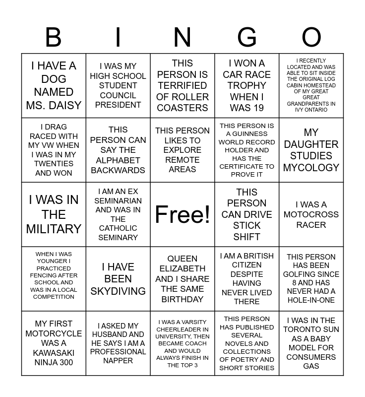 This bingo card has a free space and 24 words: MY FIRST MOTORCYCLE WAS A KAWASAKI NINJA 300, I HAVE BEEN SKYDIVING, THIS PERSON LIKES TO EXPLORE REMOTE AREAS, THIS PERSON HAS PUBLISHED SEVERAL NOVELS AND COLLECTIONS OF POETRY AND SHORT STORIES, I RECENTLY LOCATED AND WAS ABLE TO SIT INSIDE THE ORIGINAL LOG CABIN HOMESTEAD OF MY GREAT GREAT GRANDPARENTS IN IVY ONTARIO, I HAVE A DOG NAMED MS. DAISY, I WAS MY HIGH SCHOOL STUDENT COUNCIL PRESIDENT, THIS PERSON IS TERRIFIED OF ROLLER COASTERS, THIS PERSON CAN DRIVE STICK SHIFT, I WAS A MOTOCROSS RACER, I WAS IN THE MILITARY, THIS PERSON CAN SAY THE ALPHABET BACKWARDS, I AM A BRITISH CITIZEN DESPITE HAVING NEVER LIVED THERE, THIS PERSON HAS BEEN GOLFING SINCE 8 AND HAS NEVER HAD A HOLE-IN-ONE, I DRAG RACED WITH MY VW WHEN I WAS IN MY TWENTIES AND WON, I ASKED MY HUSBAND AND HE SAYS I AM A PROFESSIONAL NAPPER, I WAS A VARSITY CHEERLEADER IN UNIVERSITY, THEN BECAME COACH AND WOULD ALWAYS FINISH IN THE TOP 3, I WON A CAR RACE TROPHY WHEN I WAS 19, MY DAUGHTER STUDIES MYCOLOGY, WHEN I WAS YOUNGER I PRACTICED FENCING AFTER SCHOOL AND WAS IN A LOCAL COMPETITION, I AM AN EX SEMINARIAN AND WAS IN THE CATHOLIC SEMINARY, QUEEN ELIZABETH AND I SHARE THE SAME BIRTHDAY, THIS PERSON IS A GUINNESS WORLD RECORD HOLDER AND HAS THE CERTIFICATE TO PROVE IT and I WAS IN THE TORONTO SUN AS A BABY MODEL FOR CONSUMERS GAS.