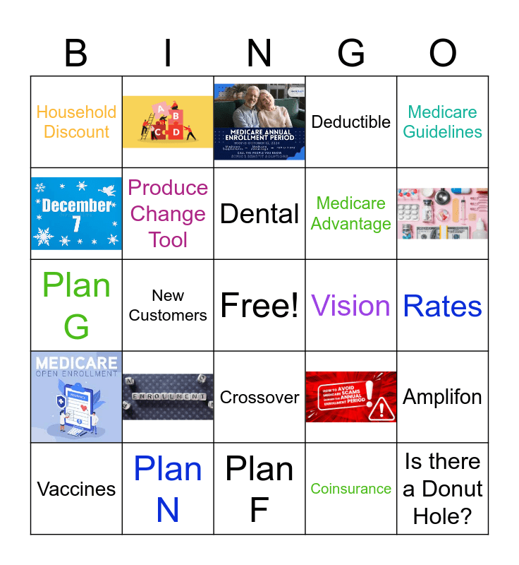 This bingo card has 21 images, a free space and 48 words: Rates, Peak Week, Produce Change Tool, Medicare Part D, Medicare Advantage, Medicare Part B, PDP, Deductible, Medicare Guidelines, Dental, Vision, Medicare Part A, Plan G, Plan N, Plan F, Grace Period, ID Card, Copay, Is there a Donut Hole?, Rate increase, December 7th, Producers, H.E.A.T, Vaccines, Coinsurance, MBI #, Claims, Crossover, Demographics, RUP, Household Discount, New Customers, Benefits, Dial America, Amplifon, Eyemed, Hospital Choice Savings, New Business Cancellations, October 15th, Initial Premiums, Providers, Gym Memberships, Guaranteed Issue Period, Customer Access, DTC, Trazact, Truassure and Payments.