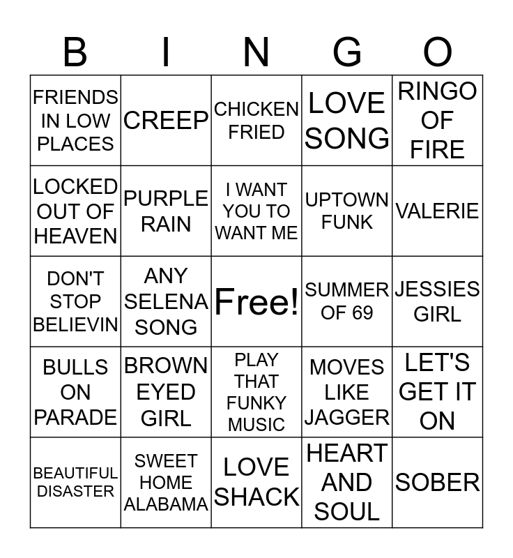 This bingo card has a free space and 24 words: BROWN EYED GIRL, SWEET HOME ALABAMA, I WANT YOU TO WANT ME, BEAUTIFUL DISASTER, RINGO OF FIRE, FRIENDS IN LOW PLACES, LOCKED OUT OF HEAVEN, CREEP, SUMMER OF 69, PLAY THAT FUNKY MUSIC, UPTOWN FUNK, DON'T STOP BELIEVIN, MOVES LIKE JAGGER, LET'S GET IT ON, PURPLE RAIN, HEART AND SOUL, JESSIES GIRL, CHICKEN FRIED, VALERIE, ANY SELENA SONG, SOBER, BULLS ON PARADE, LOVE SONG and LOVE SHACK.