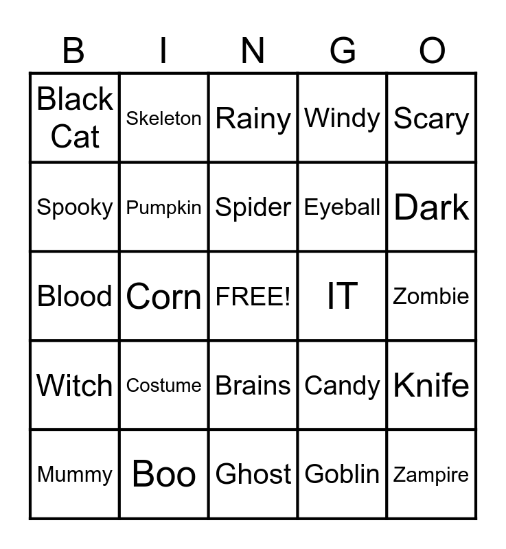 This bingo card has a free space and 29 words: Mummy, Trick, Corn, Pirate, Black Cat, Rainy, Pumpkin, Costume, IT, Boo, Zombie, Zampire, Ghost, Goblin, Dark, Treat, Brains, Witch, Scary, Blood, Candy, Broom, Eyeball, Spooky, Windy, Skeleton, Knife, Spider and Web.