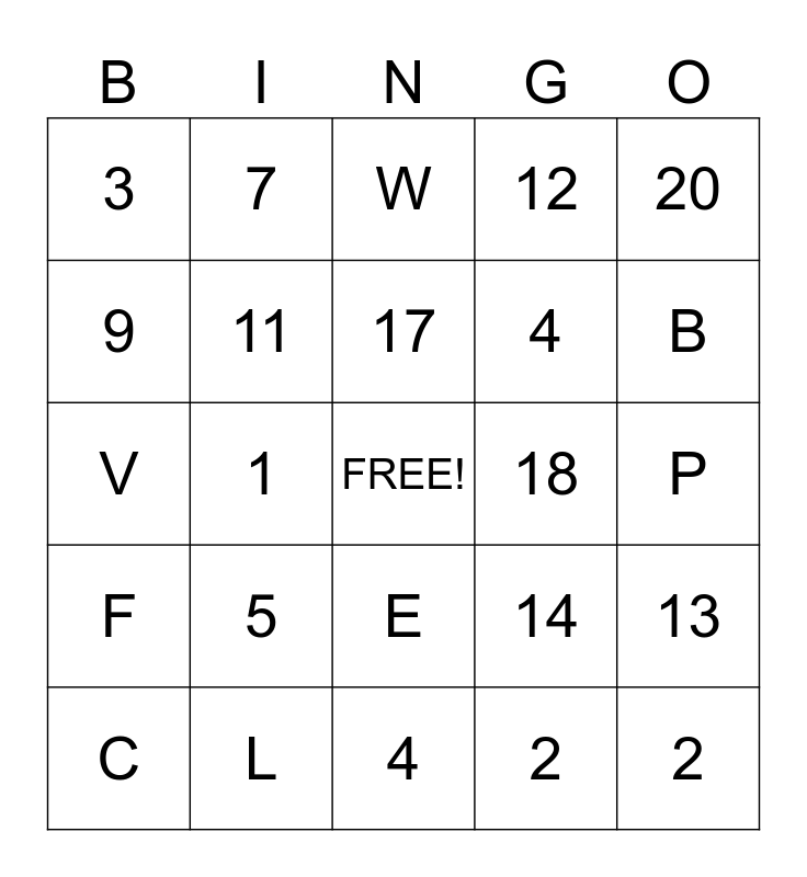 This bingo card has a free space and 49 words: 1, 2, 3, 4, 5, 6, 7, 8, 9, 10, 11, 12, 13, 14, 15, 16, 17, 18, 19, 20, 1, 2, 3, 4, A, B, C, D, E, F, H, I, J, K, L, M, N, O, P, Q, R, S, T, U, V, W, X, Y and Z.
