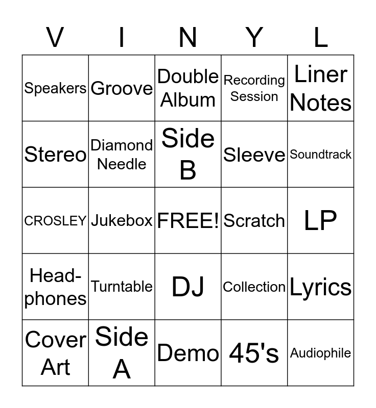 This bingo card has a free space and 24 words: Turntable, Side A, Side B, Cover Art, Liner Notes, Speakers, Stereo, Groove, Scratch, DJ, Sleeve, CROSLEY, Collection, Lyrics, Diamond Needle, 45's, LP, Double Album, Soundtrack, Jukebox, Audiophile, Head- phones, Recording Session and Demo.