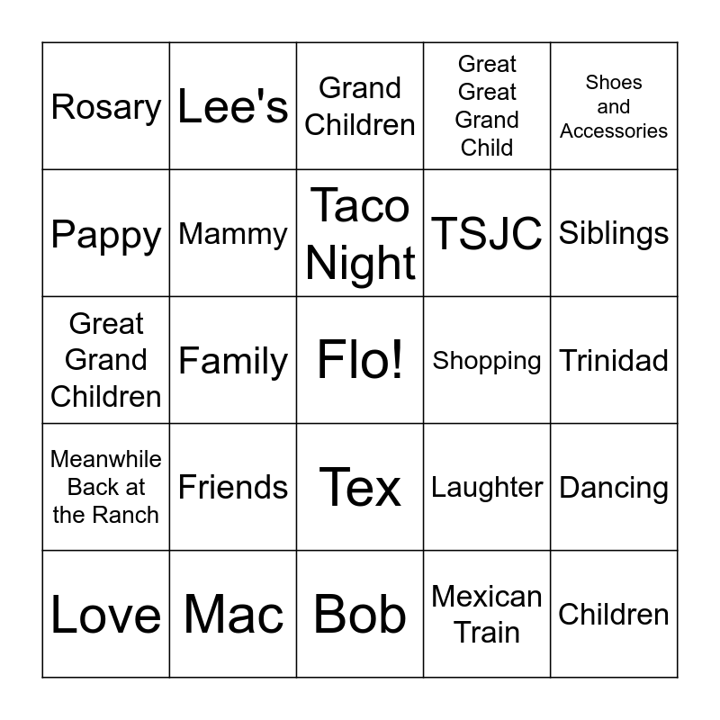 This bingo card has a free space and 24 words: Love, Friends, Taco Night, Mexican Train, Shoes and Accessories, Rosary, Lee's, Grand Children, Shopping, Trinidad, Great Grand Children, Mammy, Laughter, Dancing, Pappy, Mac, Bob, Great Great Grand Child, Siblings, Meanwhile Back at the Ranch, Family, Tex, TSJC and Children.