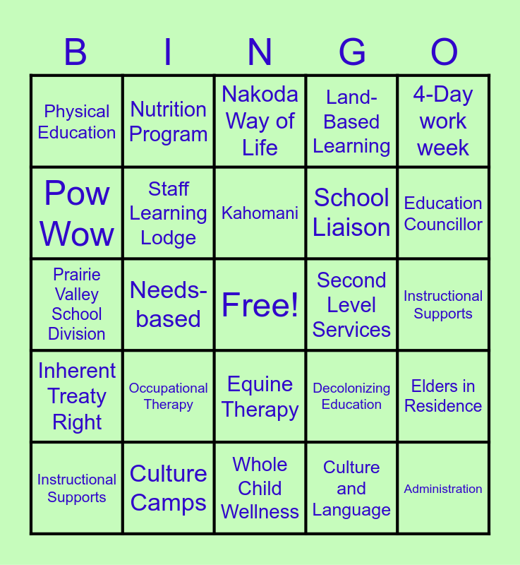 This bingo card has a free space and 44 words: Educational Assistants, Administration, Budget, Instructional Supports, School Goals, Culture and Language, Nakoda Way of Life, Language Revitalization, 4-Day work week, Culture Camps, Land-Based Learning, Second Level Services, Equine Therapy, Occupational Therapy, Speech and Language, Whole Child Wellness, Treaty Education Alliance, Prairie Valley School Division, Life Long Learning, Education Councillor, Nutrition Program, Jr Chief and Council, Transportation, Physical Education, Instructional Technology, Instructional Supports, Maintenance Upgrades, Language Revitalization, Decolonizing Education, Inherent Treaty Right, Language Videos, Elders in Residence, Identity and Pride, Graduation, Needs-based, Successes, Teachers, Lunch Program, Kahomani, Pow Wow, School Liaison, Language Instructor, Staff Learning Lodge and Holistic Education.
