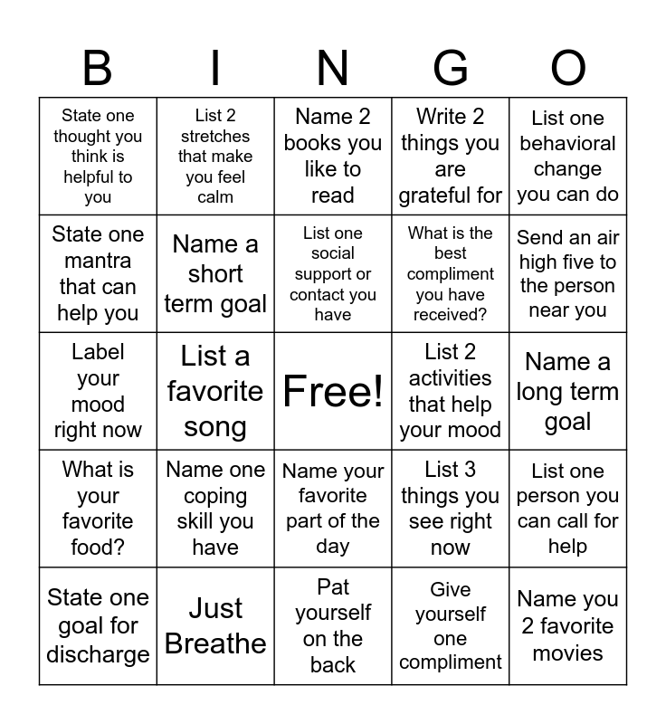 This bingo card has a free space and 24 words: Name one coping skill you have, Just Breathe, List one social support or contact you have, State one goal for discharge, List one behavioral change you can do, State one thought you think is helpful to you, State one mantra that can help you, List 2 stretches that make you feel calm, List 2 activities that help your mood, Name your favorite part of the day, What is the best compliment you have received?, Label your mood right now, List 3 things you see right now, List one person you can call for help, Name a short term goal, Give yourself one compliment, Name a long term goal, Name 2 books you like to read, Send an air high five to the person near you, List a favorite song, Name you 2 favorite movies, What is your favorite food?, Write 2 things you are grateful for and Pat yourself on the back.