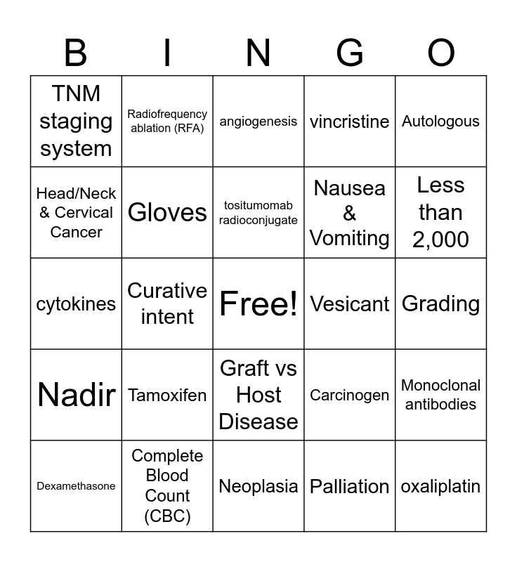 This bingo card has a free space and 27 words: Carcinogen, Tobacco, Nausea & Vomiting, Neoplasia, Head/Neck & Cervical Cancer, angiogenesis, Radiofrequency ablation (RFA), Nadir, Vesicant, Monoclonal antibodies, cytokines, vincristine, Dexamethasone, Complete Blood Count (CBC), Less than 2,000, Gloves, Gowns, & Face Shields, Gloves, tositumomab radioconjugate, Tamoxifen, TNM staging system, Grading, Palliation, Curative intent, oxaliplatin, Graft vs Host Disease, Autologous and Non-specific immunotherapy.