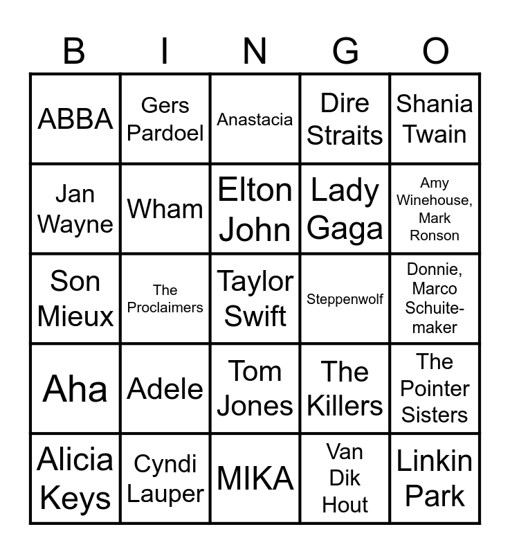 This bingo card has 69 words: Yves berendse, Donnie, Marco Schuite-maker, Tina Turner, Natalie Imbruglia, Cyndi Lauper, Whitney Houston, Dire Straits, Culture Club, Shania Twain, Phil Collins, The Pointer Sisters, Whitesnake, ABBA, Anastacia, Bruce Springsteen, The Proclaimers, Tom Jones, Lady Gaga, Los Lobos, Aha, Steppenwolf, The Killers, Amy Winehouse, Mark Ronson, Jerry Lee Lewis, Billy Joel, Guus Meeuwis, Andre Hazes, Danny de Munk, Van Dik Hout, Jeroen van der Boom, Gers Pardoel, Kriss Kross A'dam, Donnie, Gerard Joling, Racoon, Krezip, Marco Schuite-maker, Suzan & Freek, De Sjonnies, Jan Wayne, Linkin Park, Adele, Taylor Swift, John Legend, Mariah Carey, Britney Spears, Alicia Keys, Fools Garden, Wildstylez, Niels Geuzebroek, Queen, Wham, Elton John, Smash Mouth, The Rembrandts, MIKA, Guns 'n Roses, Rick Astley, Joan Jett & The Blackhearts, Gloria Gaynor, CCR, Son Mieux, The baseballs, DJ Paul Elstak, Blöf, Counting Crows, Rondé, Di-rect, Blöf, Geike, Walk the Moon, Diggy Dex and Volbeat.