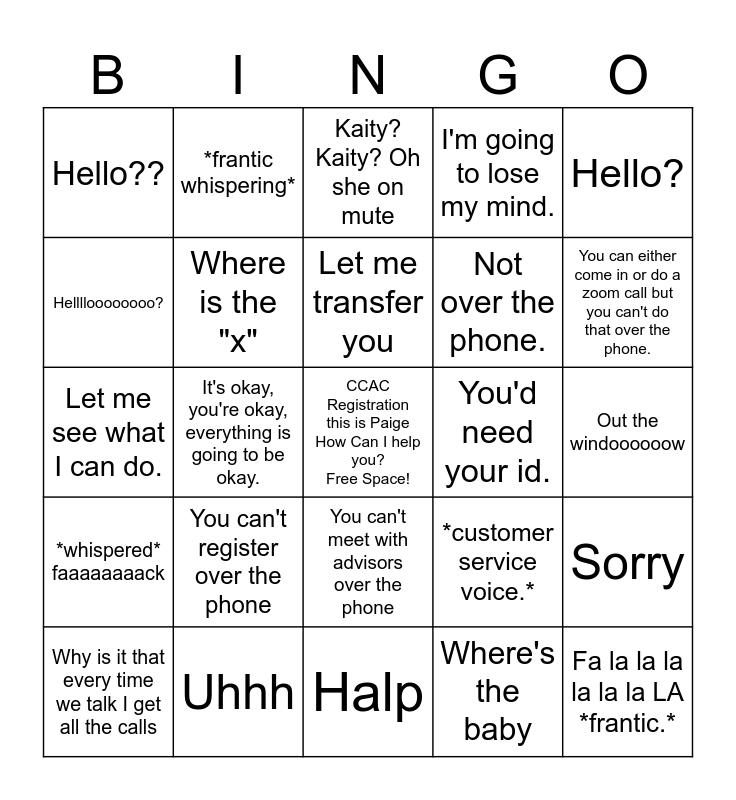 This bingo card has a free space and 24 words: You can't register over the phone, Uhhh, Let me transfer you, Why is it that every time we talk I get all the calls, Hello?, Hello??, Helllloooooooo?, *frantic whispering*, You'd need your id., You can't meet with advisors over the phone, Not over the phone., Let me see what I can do., *customer service voice.*, Sorry, Where is the "x", Where's the baby, Out the windoooooow, Kaity? Kaity? Oh she on mute, You can either come in or do a zoom call but you can't do that over the phone., It's okay, you're okay, everything is going to be okay., Fa la la la la la la LA *frantic.*, *whispered* faaaaaaaack, I'm going to lose my mind. and Halp.