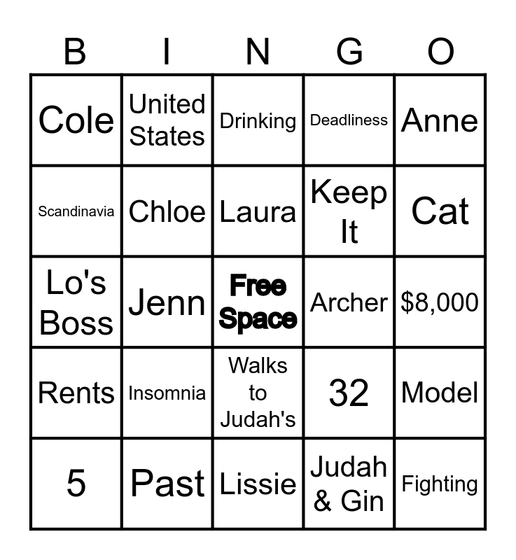 This bingo card has a free space and 24 words: 5, Insomnia, Laura, Judah & Gin, Anne, Cole, United States, Drinking, Archer, $8,000, Lo's Boss, Chloe, 32, Model, Scandinavia, Past, Lissie, Deadliness, Cat, Rents, Jenn, Walks to Judah's, Keep It and Fighting.