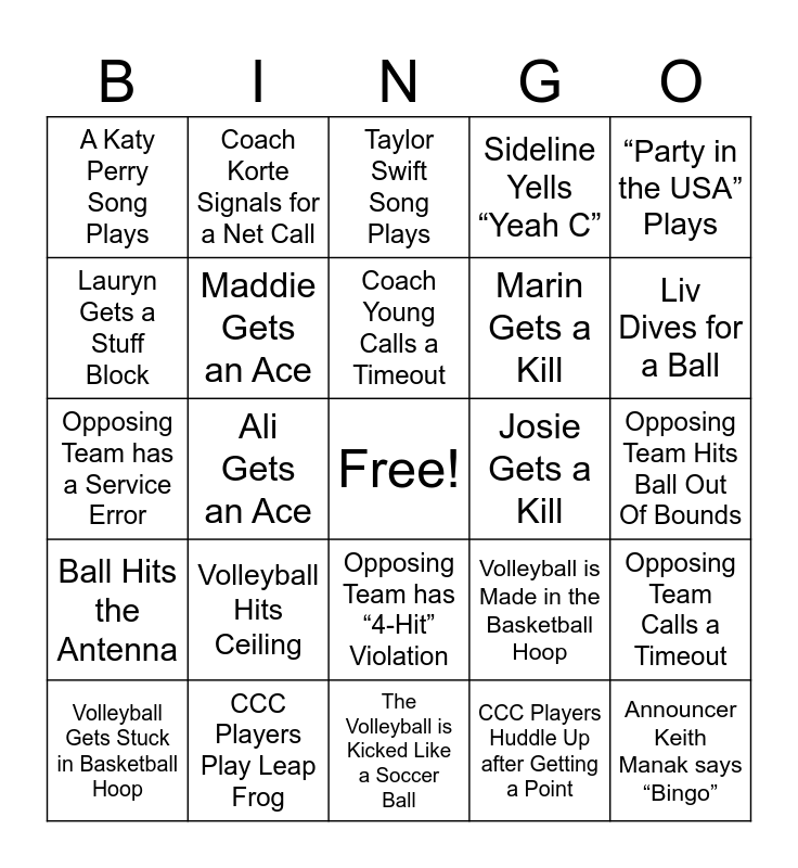 This bingo card has a free space and 29 words: Volleyball Gets Stuck in Basketball Hoop, Volleyball Gets Hit into Stands, Ali Gets an Ace, “Don’t Stop Believing” Plays, A Katy Perry Song Plays, Taylor Swift Song Plays, Maddie Gets an Ace, Volleyball Hits Ceiling, Josie Gets a Kill, CCC Players Play Leap Frog, Opposing Team Hits Ball Out Of Bounds, Announcer Keith Manak says “Bingo”, The Volleyball is Kicked Like a Soccer Ball, CCC Players Huddle Up after Getting a Point, Liv Dives for a Ball, Josie Gets a Block, Opposing Team has “4-Hit” Violation, Ball Hits the Antenna, “Party in the USA” Plays, Opposing Team has a Service Error, Volleyball is Made in the Basketball Hoop, Libbie Gets an Assist, Marin Gets a Kill, Lauryn Gets a Stuff Block, Sideline Yells “Yeah C”, Coach Korte Signals for a Net Call, Opposing Team Calls a Timeout, Coach Young Calls a Timeout and “Super Bass” Plays.