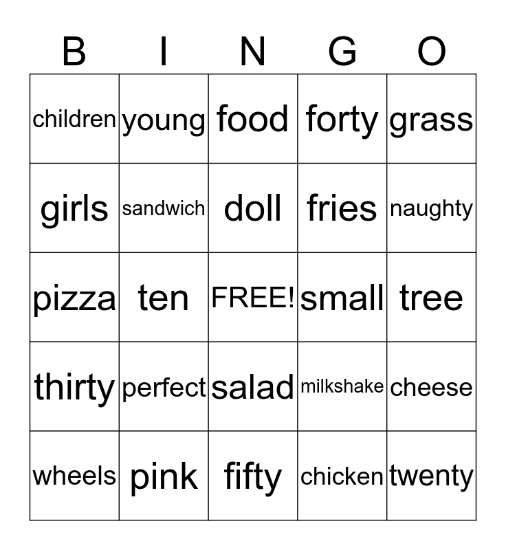 This bingo card has a free space and 24 words: perfect, pink, doll, wheels, grass, children, girls, young, small, salad, fries, pizza, milkshake, cheese, sandwich, chicken, tree, food, naughty, ten, twenty, thirty, forty and fifty.