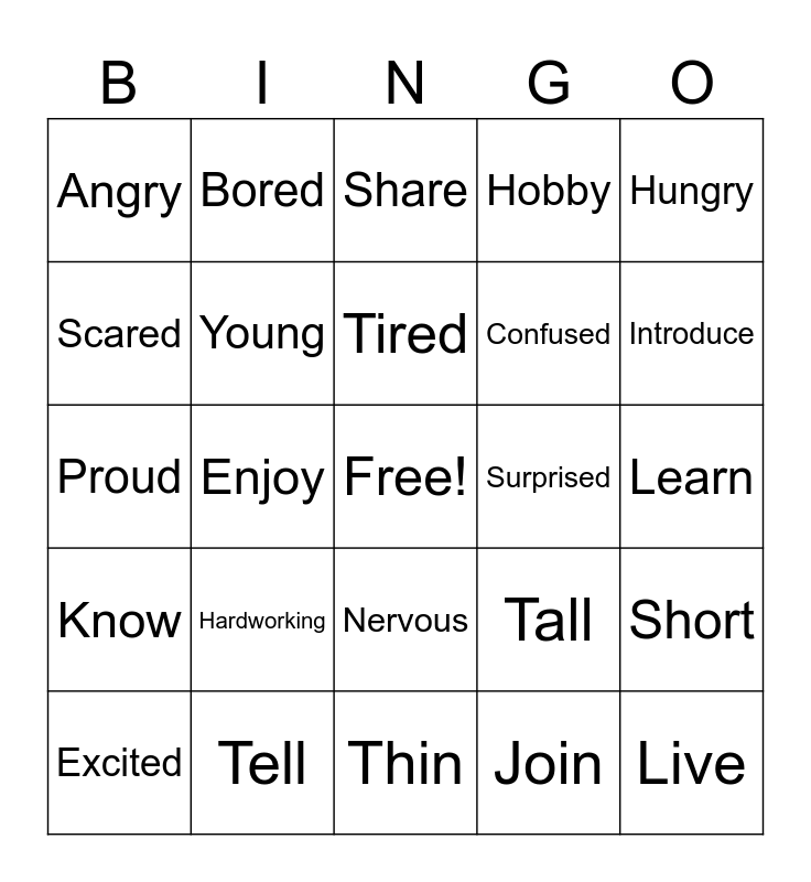 This bingo card has a free space and 25 words: Hardworking, Thin, Tired, Excited, Hungry, Angry, Scared, Bored, Surprised, Nervous, Confused, Proud, Tall, Short, Young, Small, Learn, Share, Introduce, Enjoy, Live, Tell, Know, Hobby and Join.