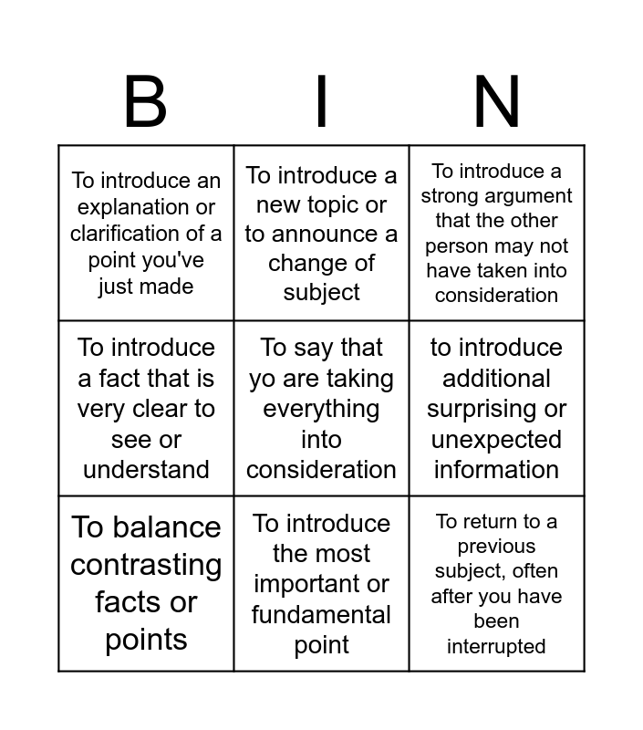 This bingo card has a free space and 8 words: to introduce additional surprising or unexpected information, To introduce a strong argument that the other person may not have taken into consideration, To introduce a new topic or to announce a change of subject, To balance contrasting facts or points, To introduce an explanation or clarification of a point you've just made, To return to a previous subject, often after you have been interrupted, To introduce a fact that is very clear to see or understand and To introduce the most important or fundamental point.